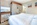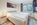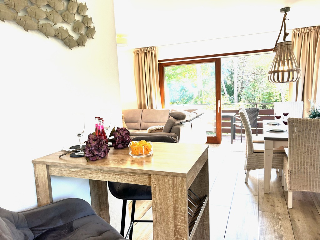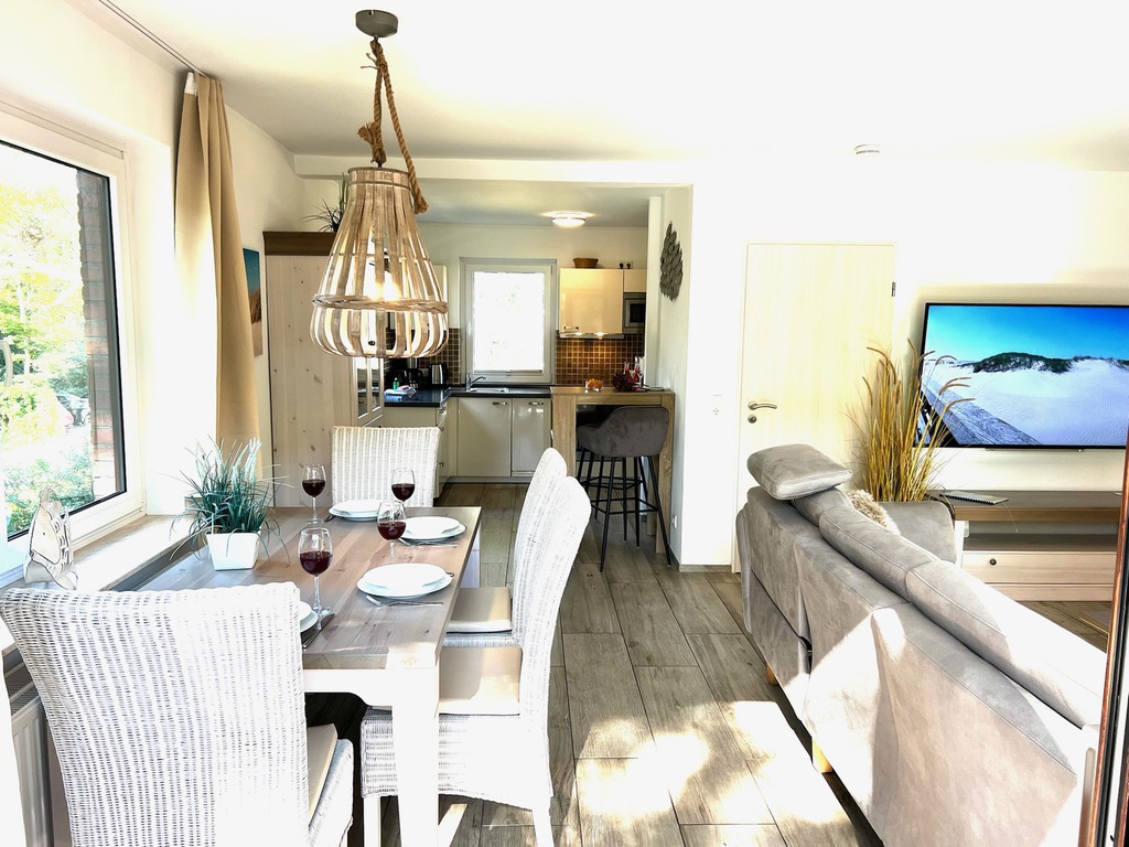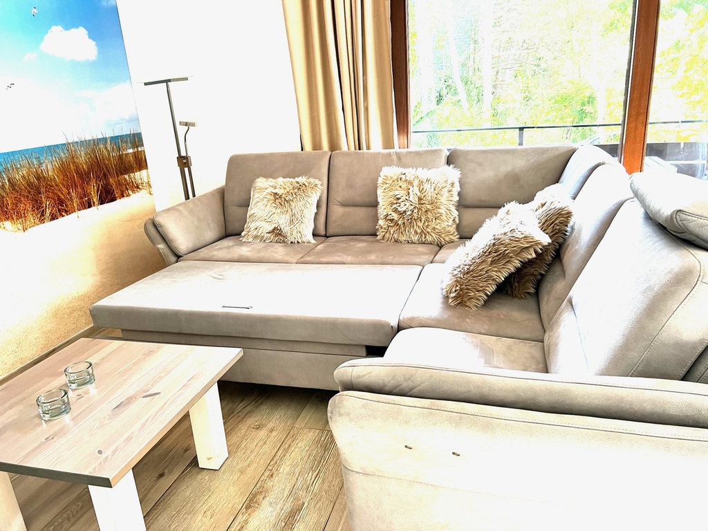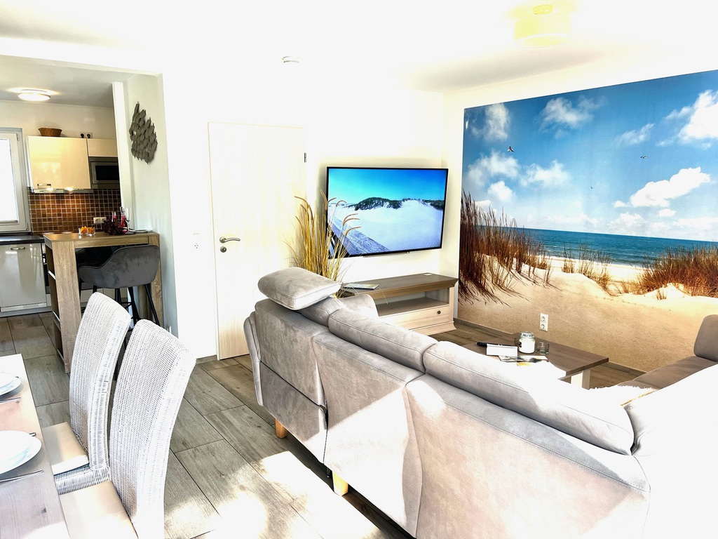Die behagliche Wohnung hat ein Wohn-/Schlafzimmer mit Doppelschlafcouch (mit elektrischer Lehnen- und Fußfunktion einseitig), einen großen Esstisch, Smart TV, ein Schlafzimmer mit Doppelbett