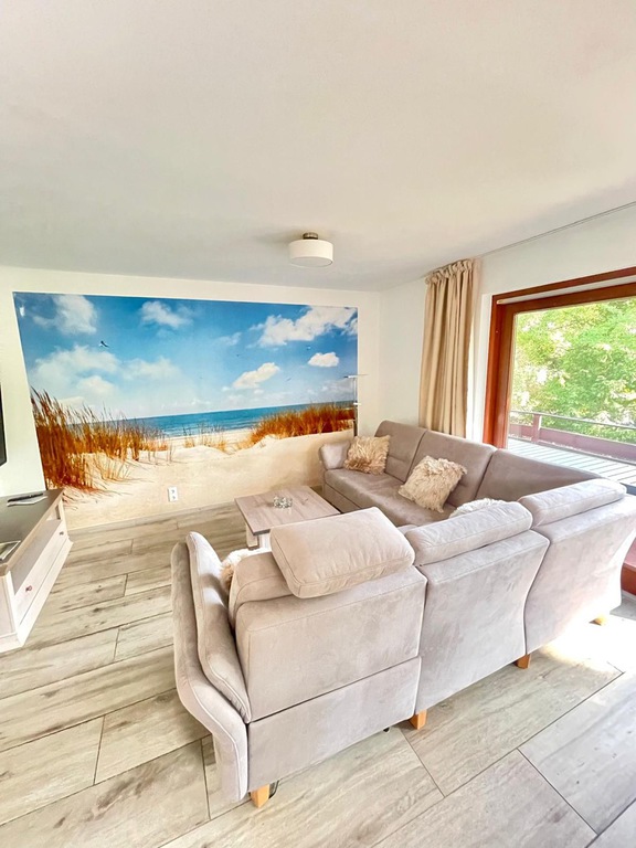 und ebenfallsSmart TV, und eine Einbauküche. Ein Duschbad, ein davon getrenntes WC. Einen 14 qm großen Balkon. Die Wohnfläche beträgt ca. 57qm.